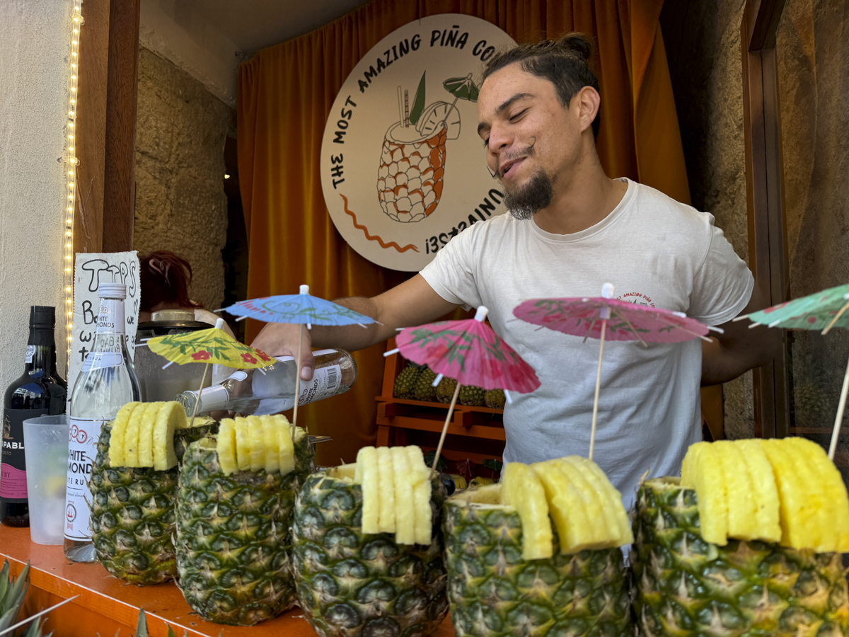 We kicked off our Portugal chapter in Porto, thanks to a nudge from an artsy friend who insisted we’d love it. He was right. Porto has a slightly gritty charm, in the best possible way. A bit weathered, full of colour and character, with street art punctuating closed store fronts. It felt vibrant and safe, like a city comfortable in its own skin. We wandered across the Dom Luís I Bridge, explored side streets, and at one point Randy treated me to an outrageously big—and quite strong—piña colada served in an actual pineapple.